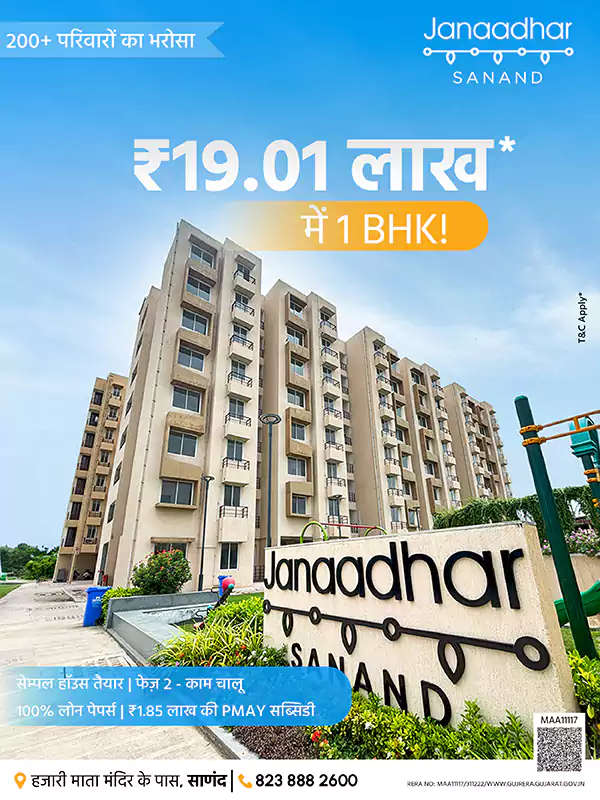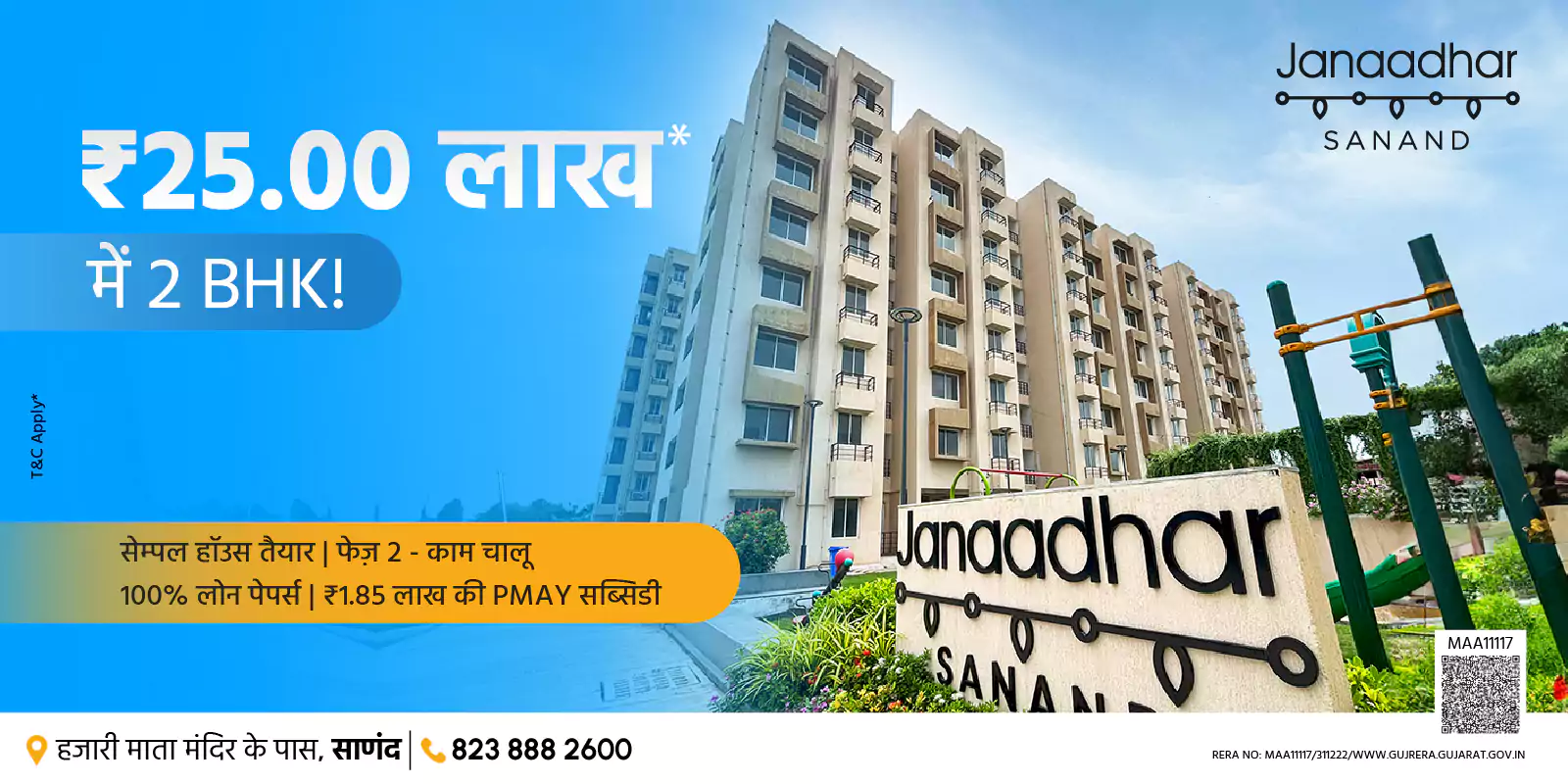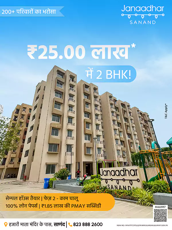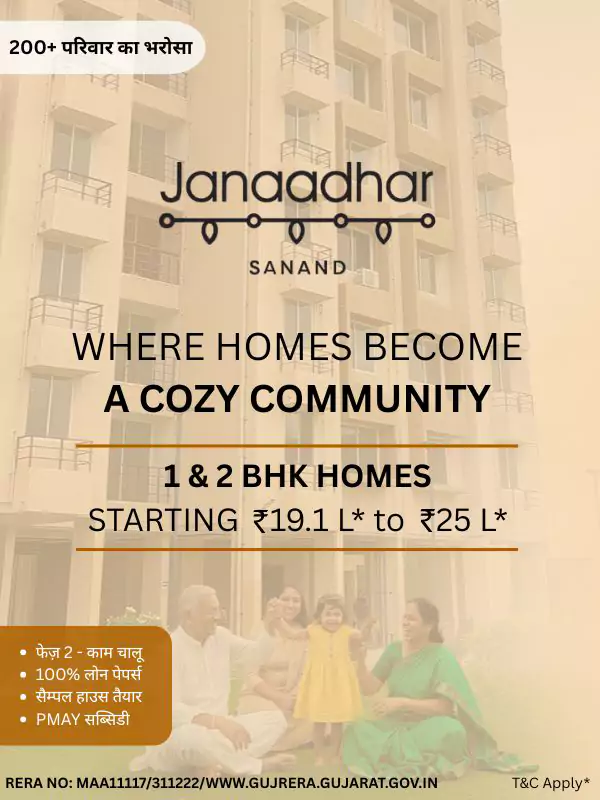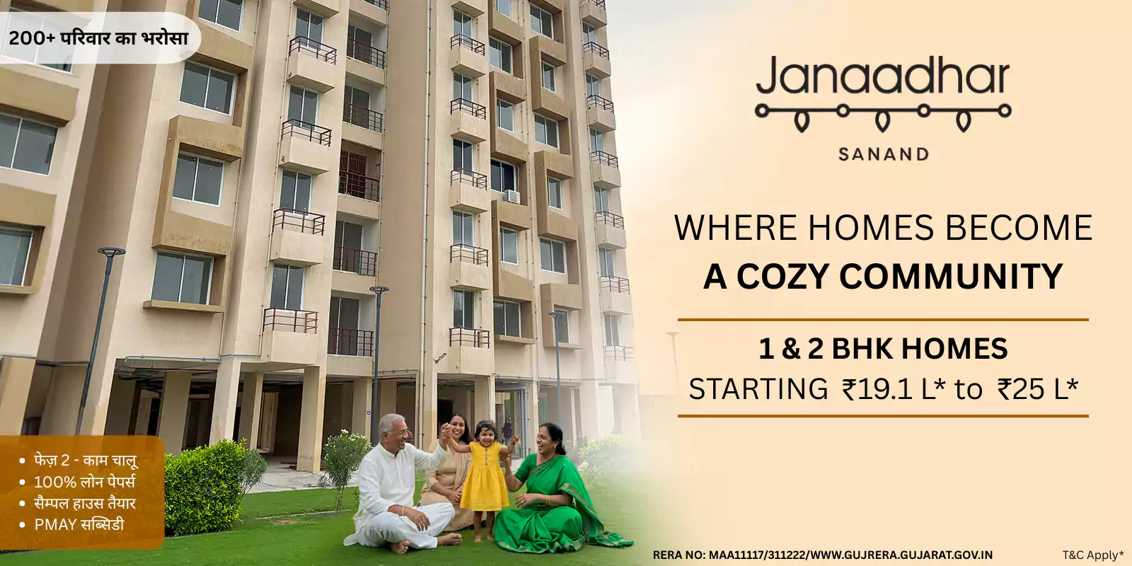 Experience Janaadhar Sanand: A premier affordable housing community in Sanand, Ahmedabad. With 230 homes delivered and more under development, we offer 1 and 2 BHK apartments equipped with modern amenities. Enjoy quality living in a vibrant neighborhood.