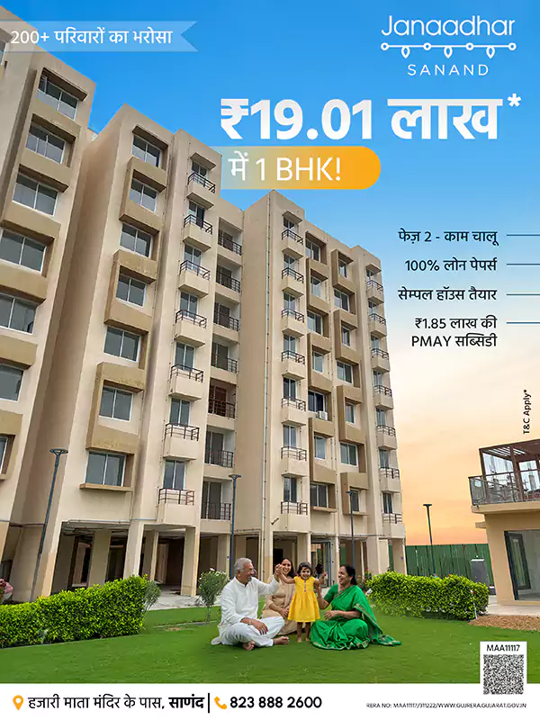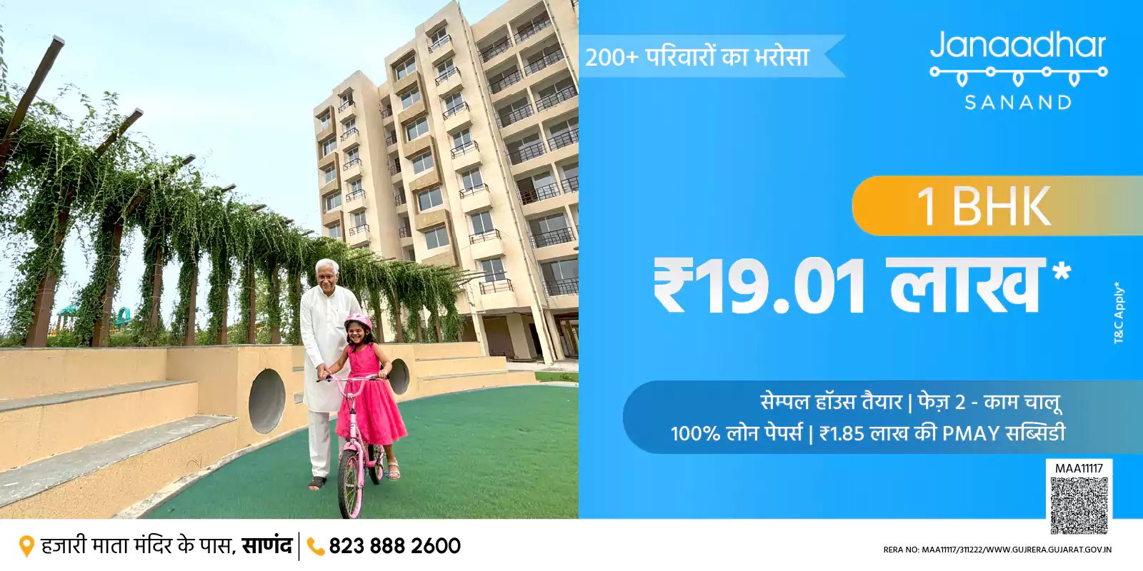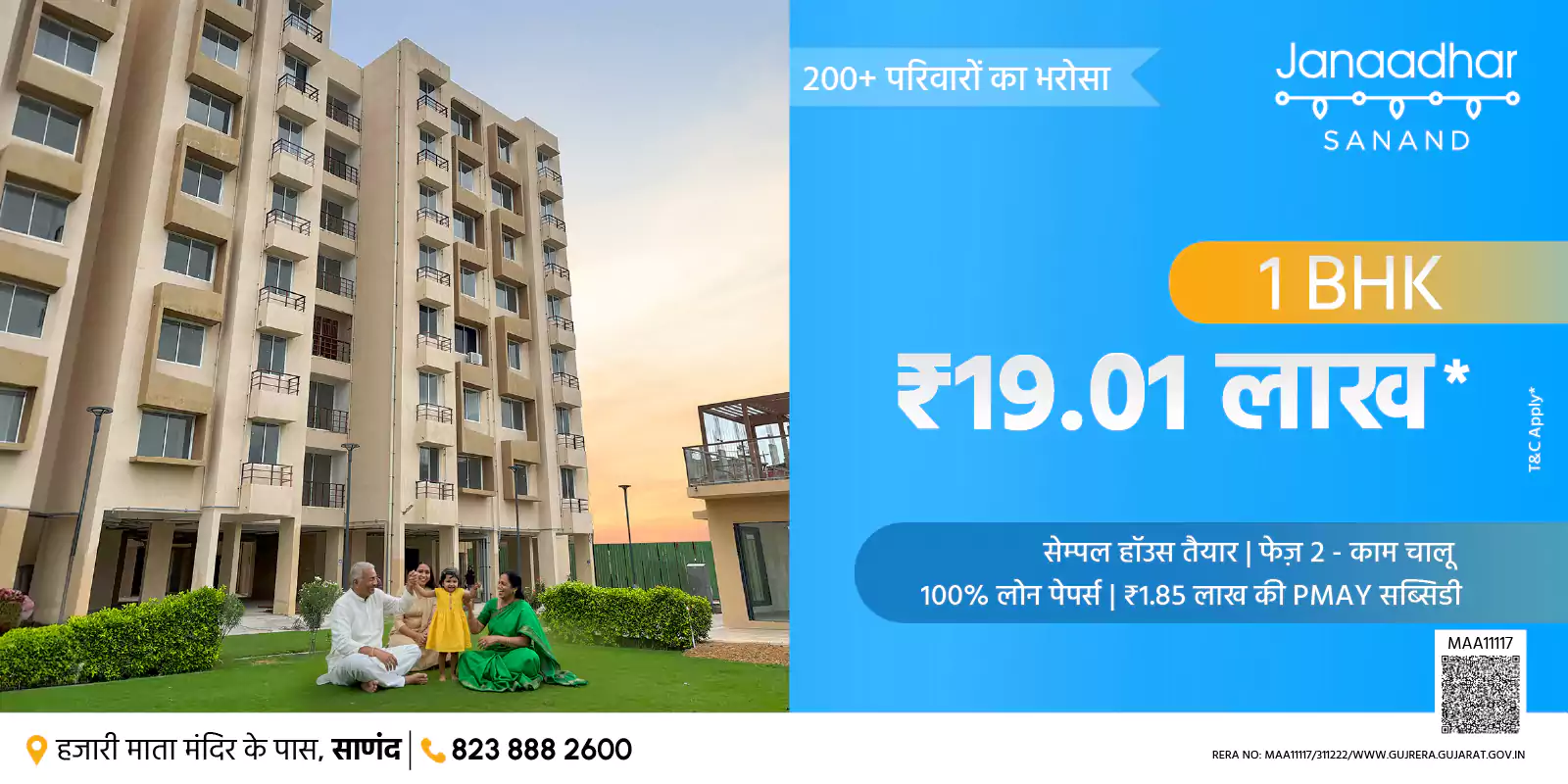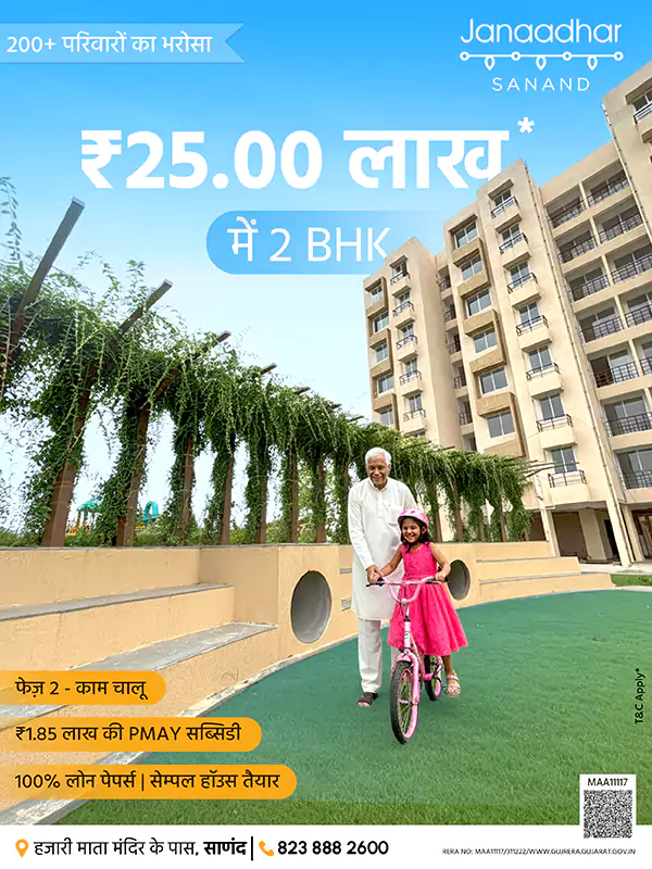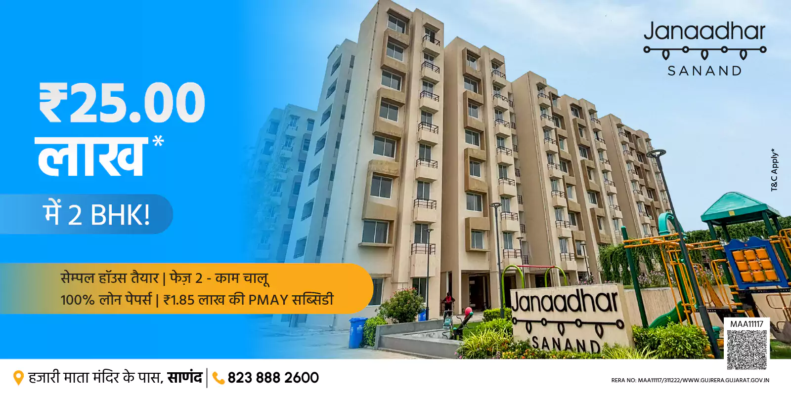 Experience Janaadhar Sanand: A premier affordable housing community in Sanand, Ahmedabad. With 230 homes delivered and more under development, we offer 1 and 2 BHK apartments equipped with modern amenities. Enjoy quality living in a vibrant neighborhood.